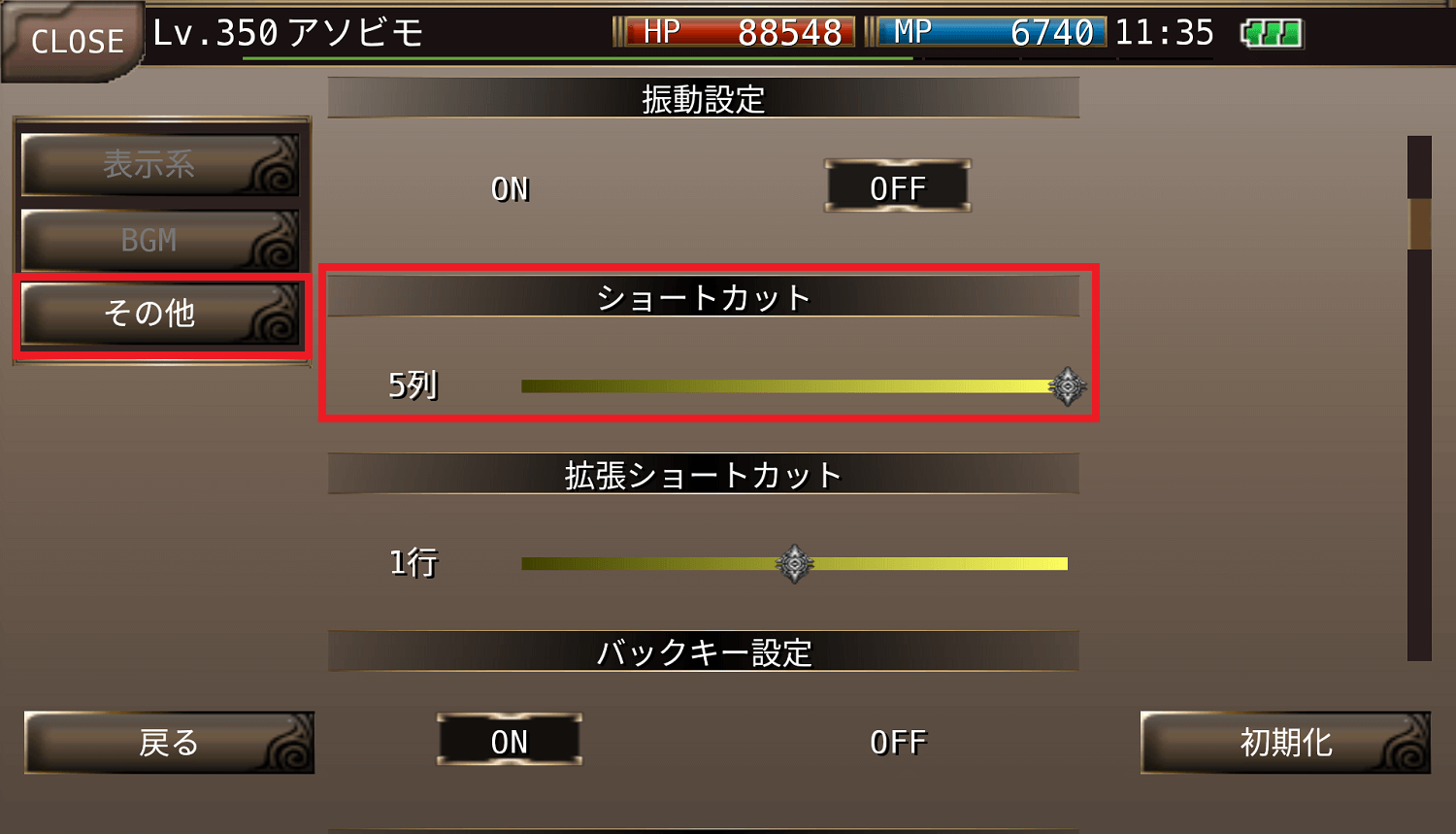 ※ショートカットが5列の時に継続効果の表示と重なる場合がございますが仕様です。予めご了承ください。
