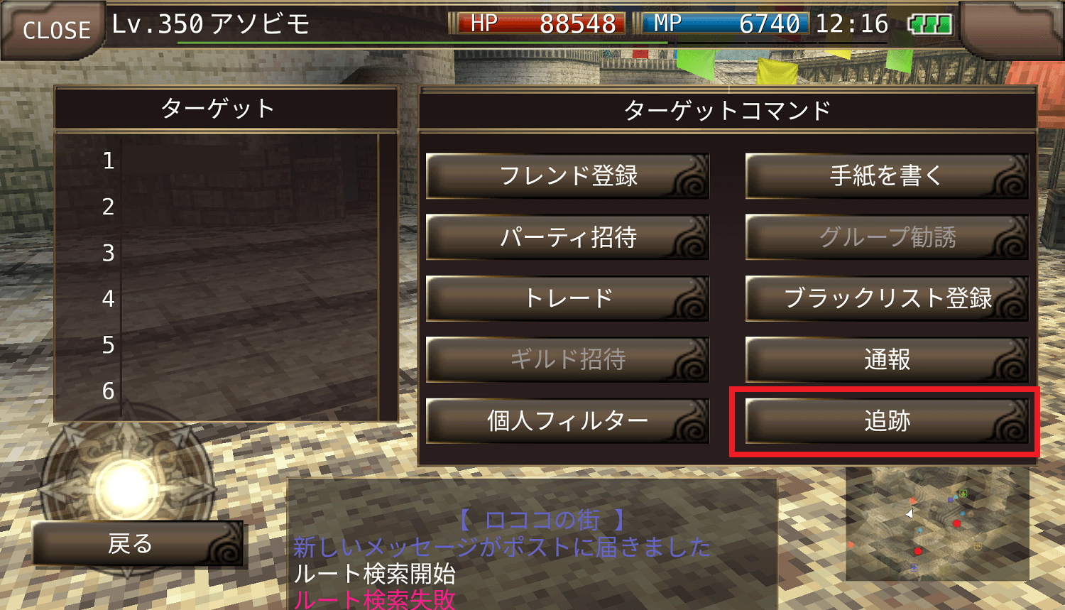 ※自分や選択したターゲットの場所によっては追跡移動ができない場合や途中で移動が停止する場合がございます。